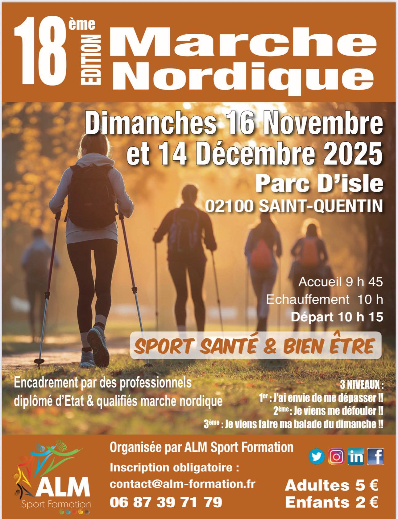 ALM Sport Formation organise une marche nordique au départ du parc d'Isle à Saint-Quentin les : - dimanche 16 novembre 2025 à 10h. - dimanche 14 décembre 2025 à 10h. Accueil à partir de 9h45. Inscription obligatoire : contact@alm-formation.fr / 06 87 39 71 79 Tarifs : 5€ adulte, 2€ enfant