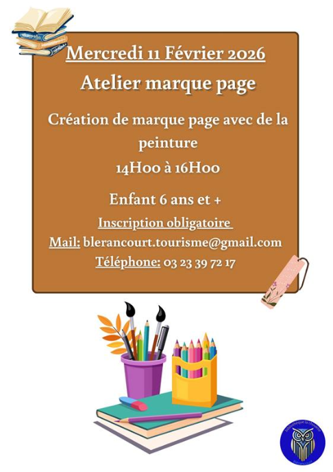Atelier marque-page à Blérancourt le 11 février de 14h à 16h. Pour les enfants de 6 ans et +. Atelier gratuit. Inscription obligatoire: Par mail: blerancourt.tourisme@gmail.com Tel : 03 23 39 72 17