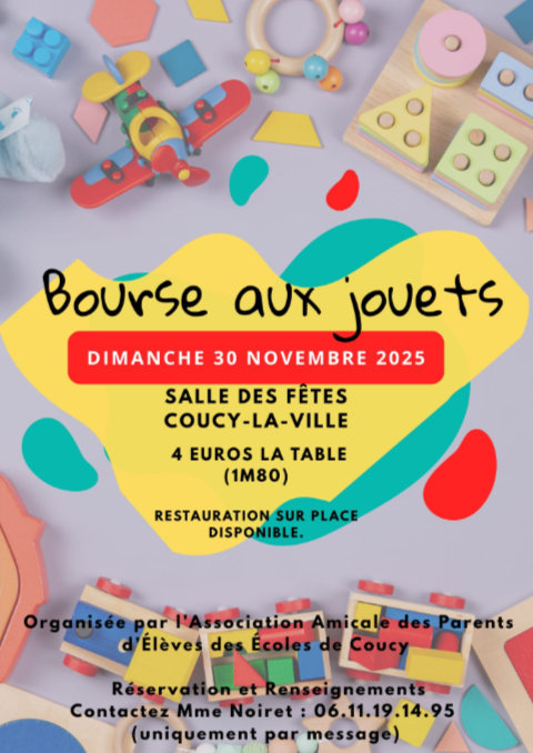 Bourses aux jouets le dimanche 30 novembre à la salle des fête de Coucy-la-Ville. Évenement organisé par l'Association Amicale des Parents d'Élèves des Écoles de Coucy. 4€ la table, 1m80. Réservation et renseignements : 06 11 19 14 95 (uniquement par message) Restauration sur place.