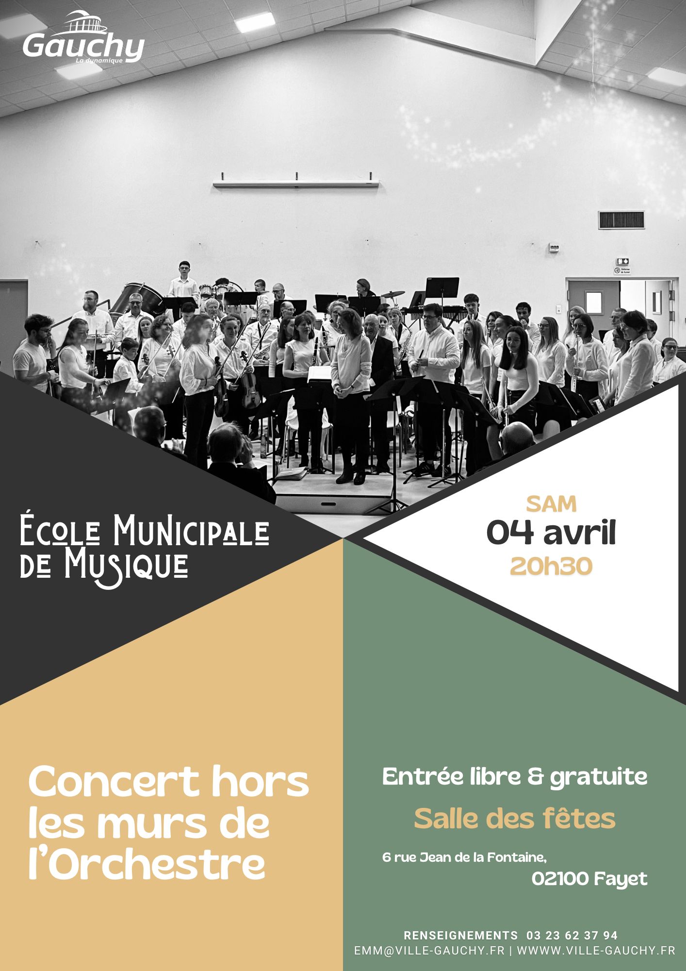 Les musiciens de l’École Municipale de Musique de Gauchy vous invitent à partager une soirée musicale pleine d’émotions. Pour ce concert exceptionnel, l’orchestre fera résonner un programme riche et varié, interprété par des passionnés de tous horizons.