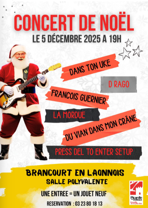 Concert de Noel à Brancourt-en-Laonnois à 19h à la salle polyvalente. Au programme, Dans ton uke, D Rago, François Guernier, La mordue, Du vian dans mon crâne, press del to enter setup. Une entrée = un jouet neuf. Réservation au 03 23 80 18 13