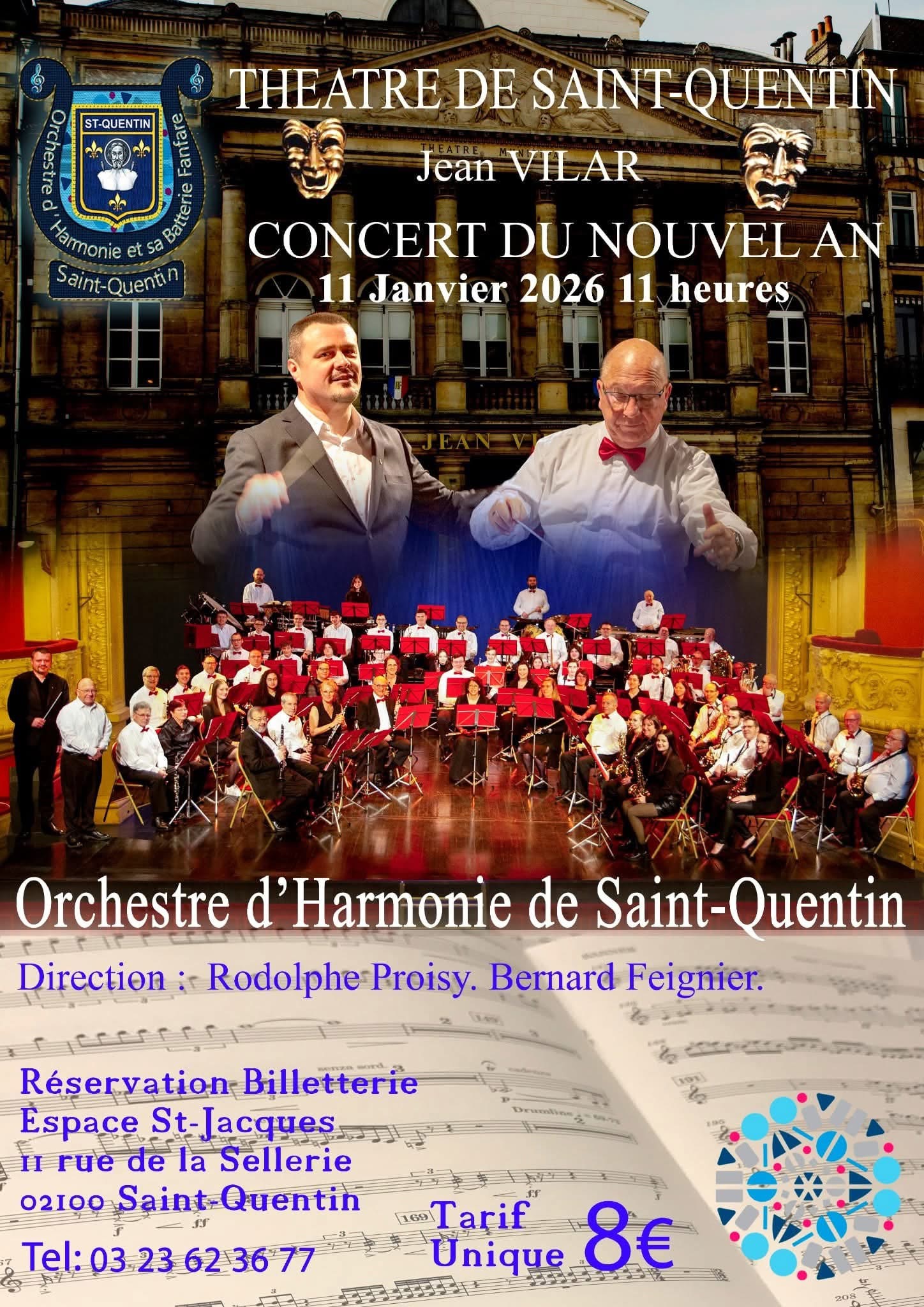 L’orchestre d’harmonie de Saint-Quentin vous convie à son traditionnel (et magnifique) concert du Nouvel An qui se tiendra le dimanche 11 janvier 2026 à 11 heures au théâtre Jean Vilar. Entrée : 8€. Réservation à la billetterie de l’espace Saint-Jacques (14 rue de la sellerie).