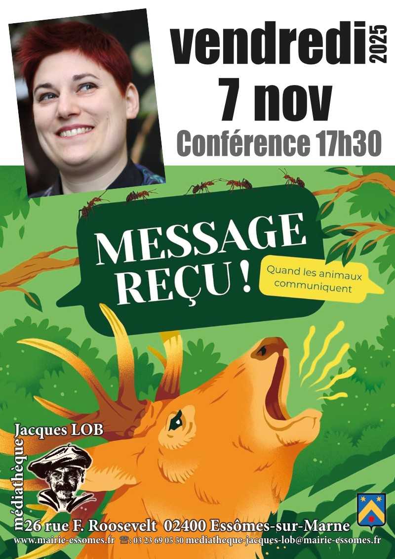 Vendredi 7 novembre à 17h30 – Conférence - (pour tout public) Agatha (Docteur en éthologie) nous explique comment les animaux communiquent grâce à leurs sens, comment ils s’adaptent à leur milieu (dans le noir, sous l’eau, à distance, dans un environnement perturbé par l’humain, par exemple).