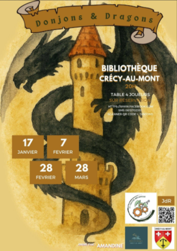 Rendez-vous le 17 janvier, 7 février, 28 février, 28 mars pour découvrir le jeu Donjons & Dragons à la bibliothèque de Crécy-Au-Mont. Au programme plongez dans l’aventure avec Donjons et Dragons ! Une table pour 4 joueurs vous attend. Amandine sera votre Maître de Jeu pour guider l’histoire. Séance réservée aux adultes pour des quêtes épiques et immersives. Gratuit, sur réservation. Information sur le site https://www.facebook.com ou scanner le QR code .