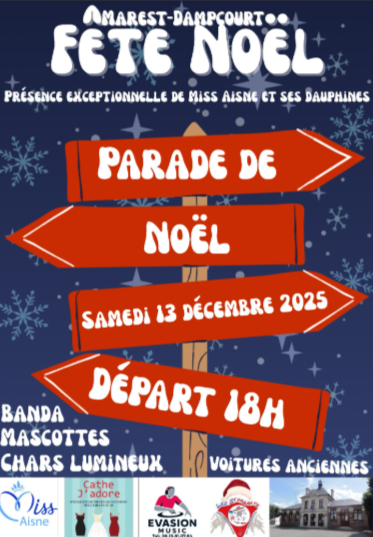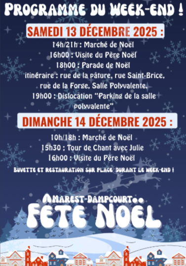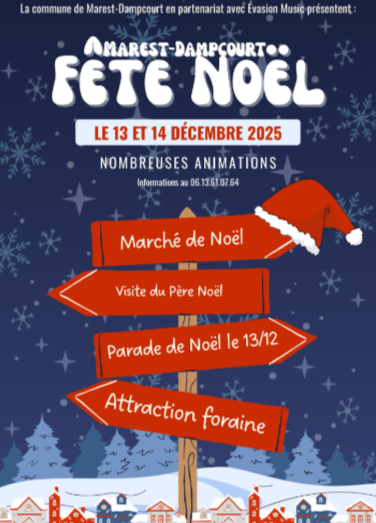 Fête de Noel à Marest-Dampcourt le 13 et 14. Au programme, marché de Noel, visite du Père Noel, parade de Noel (chars, mascottes...) et attraction. Le samedi vous pourrez profiter du marché, de la vsitie du Père Noel, de la parade et la dimanche il y aura un cours de chant à 15h30 et toujours la présence du Père Noel. Vous aurez l'occasion également de profiter de la présence exceptionnelle de Miss Aisne et ses dauphines. Buvette et restauration sur place. Infos: 06 13 61 07 64
