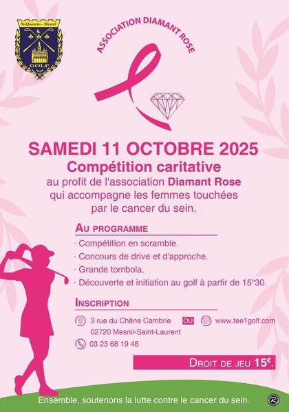 Le samedi 11 octobre, venez participer à une compétition caritative organisée par Saint-Quentin - Mesnil golf pour soutenir l'association Diamant Rose ! Au programme : - Compétition en scramble. - Concours de drive et d'approche. - Grande tombola. - Découverte et initiation au golf à partir de 15h30. Inscription : -3 rue du Chêne Cambrie - 03 23 68 19 48 - www.tee1golf.com Droit de Jeu 15€.