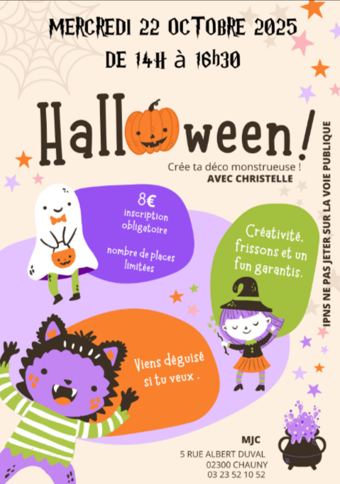 Halloween à la MJC le mercredi 22 octobre de 14h à 16h30. Au programme, création de décoration d'Halloween avec Christelle. Tarif : 8€, inscription obligatoire car nombre de places limitées. Viens déguisé si tu le souhaites. Infos : 03 23 52 10 52