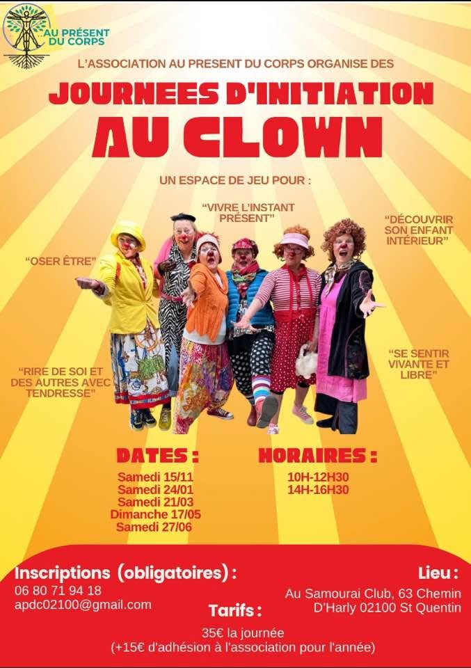 L'association au présent du corps vous propose des journées d'Initiation au Clown ! Un espace de jeu pour rire de soi et des autres avec tendresse et se sentir libre et vivant. Dates : Samedi 15/11 Samedi 24/01 Samedi 21/03 Dimanche 17/05 Samedi 27/06 Horaires : 10h-12h30 et 14-16h30 Tarif : 35€ la journée, plus 15€ d'adhésion à l'association pour l'année. Au Samourai Club, situé au 63 chemin d'Harly, 02100 Saint-Quentin. Inscription obligatoire au 06 80 71 94 18 ou apdc02100@gmail.com
