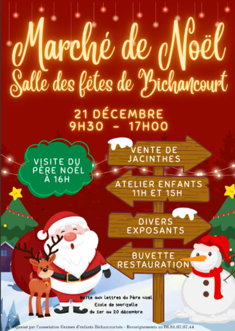 Marché de Noel à la salle des fêtes de Bichancourt le 21 décembre de 9h30 à 17h. Au programme: vente de jacinthes, ateliers enfants de 11h à 15h, de nombreux exposants. Visite du Père Noel à 16h. Vous pourrez vous restaurer sur place, et il y a également une buvette. Organisé par l'association Graines d'enfants Bichancourtois. infos : 06 81 07 07 44 Boîte aux lettres du Père Noel à l'École de Marizelle du 1er au décembre.