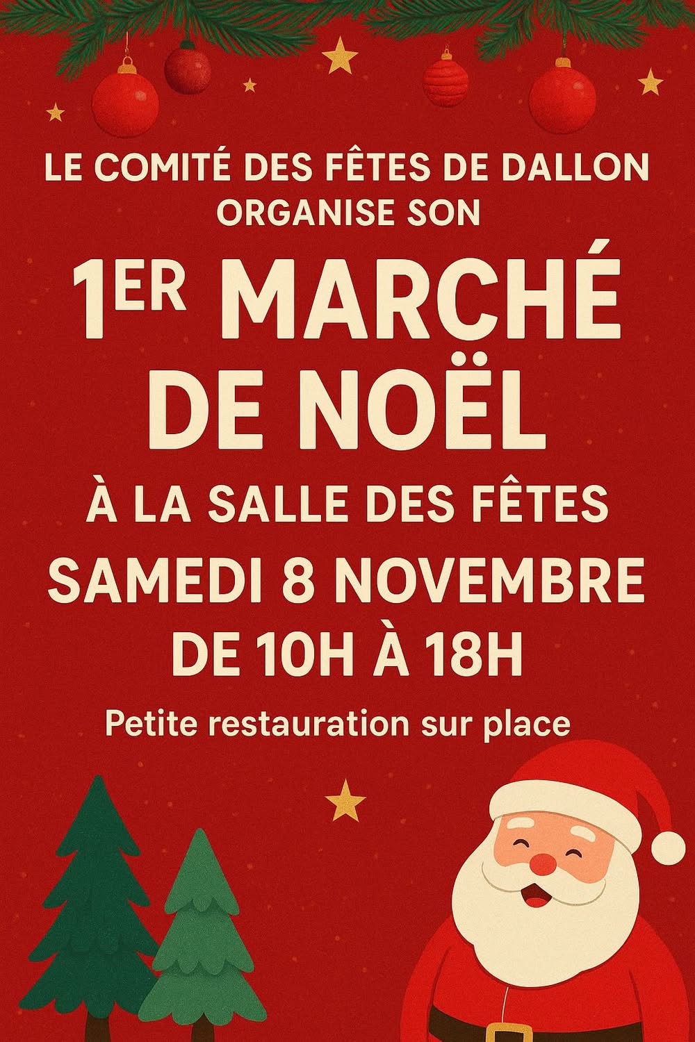 Le comité des fêtes de Dallon organise son premier marché de Noël le samedi 8 novembre 2025 de 10h à 18h à la salle des fêtes.