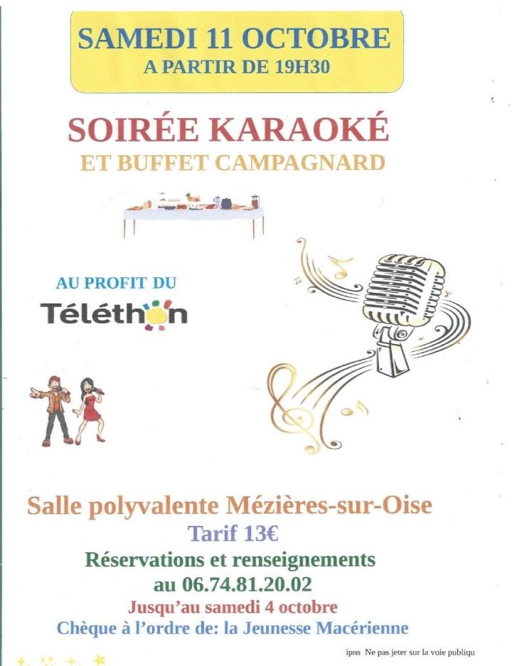 La Jeunesse Macérienne organise une soirée karaoké et buffet campagnard au profit du téléthon ! Rendez-vous à la salle polyvalente de Mézières-sur-Oise le samedi 11 octobre à partir de 19h30. Réservations et renseignements au 06 74 81 20 02 jusqu'au 4 octobre. Tarif : 13€, chèque à l'ordre de la Jeunesse Macérienne.