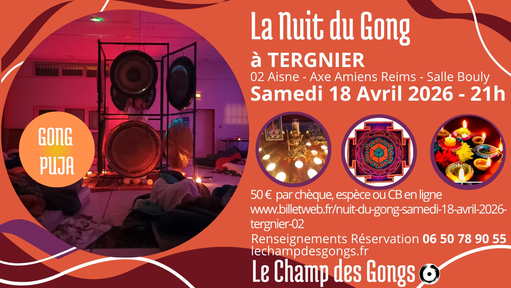 Rendez-vous le samedi 18 avril à 21h jusu'au dimanche 19 avril à 8h à la salle Bouly à Tergnier pour la Nuit du Gong. "Les réservations ont commencé." La Nuit du Gong est une cérémonie de purification qui se déroule pendant toute une nuit, en immersion totale dans la vibration des Gongs. Cet espace va permettre à notre esprit de s'ouvrir à d'autres plans de l'existence, à d'autres dimensions de la conscience. De par la configuration et la durée du rituel est créée une opportunité d'explorer notre Univers intérieur, de prendre le temps pour ouvrir les portes vers des plans méconnus. Mais aussi pour laisser sortir les émotions bloquées et accumulées avec le temps. C’est un véritable nettoyage énergétique qui se déroule en douceur. La Nuit du Gong est le moment privilégié pour prendre le temps de recevoir les vibrations dans chaque cellule et se remplir d'une énergie régénératrice. Durant 7h30 de bain sonore, des brèches dans les différentes couches de l'inconscient vont permettre à l'esprit conscient de mettre en lumière des schémas de pensées, des empreintes et des comportements jusque-là restés dans l'ombre. " Les effets sont proches des bains de Gongs mais plus profonds" ils ont une portée sur plus long terme, parfois des mois après le rituel. C'est l'opportunité de prendre le temps de baigner dans le champ vibratoire des Gongs" Sur réservation : lechampdesgongs@gmail.com ou au 06 50 78 90 55 Par l'association le Champ des Gongs. 50€ par chèque ou en espèce et en CB en ligne via billetweb.fr