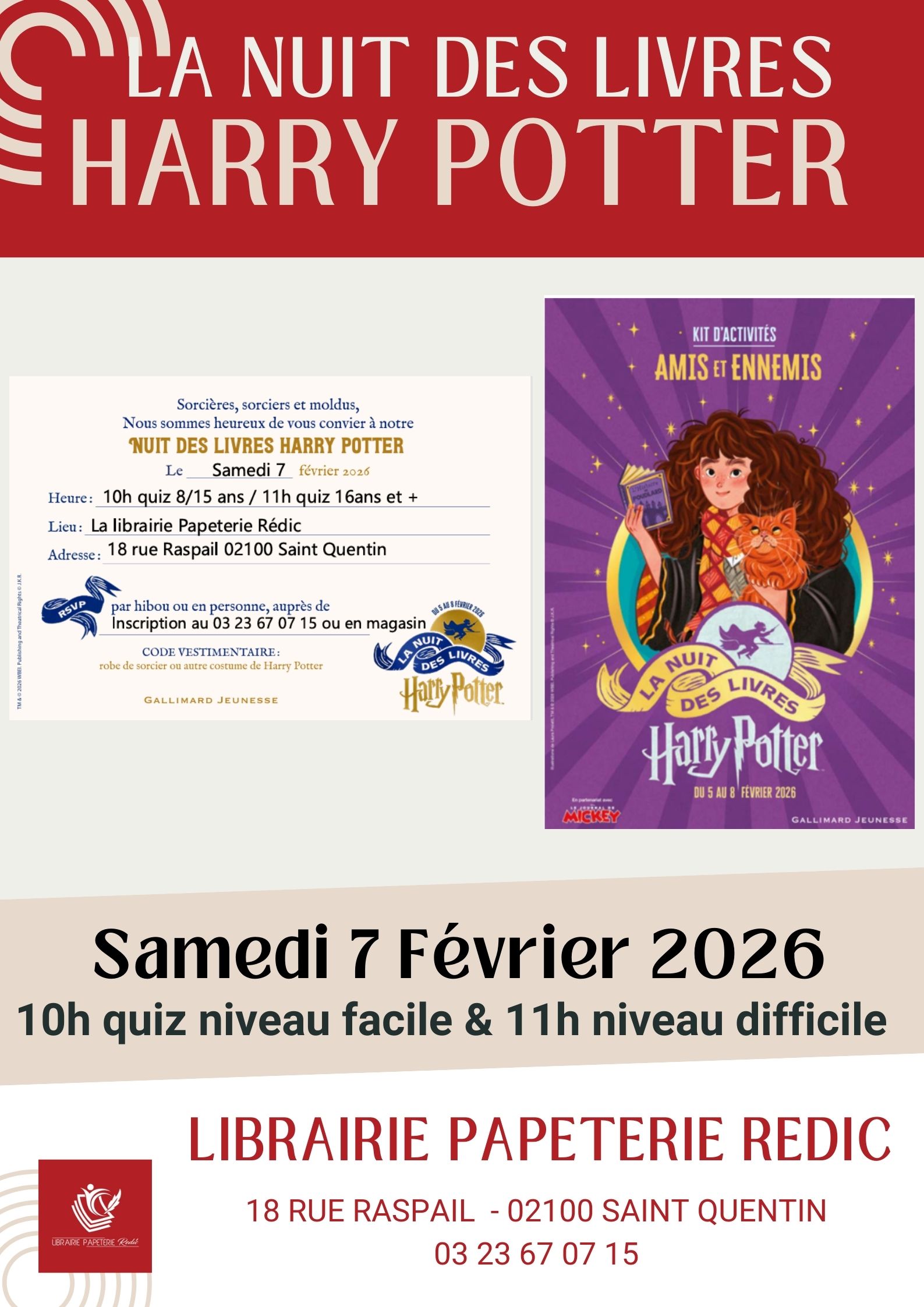 La librairie Rédic vous invite à un moment magique dans l'univers des sorciers à l'occasion de la Nuit des livres Harry Potter ! Au programme : animations gratuites, surprises et magie au rendez-vous. À 10h : Quizz 8/15 ans (facile) À 11h : Quizz 16 ans et plus (difficile) Inscription obligatoire en magasin ou au 03 23 67 07 15. À partir de 8 ans, places limitées LIbrairie Rédic , 18 rue Raspail, 02100 Saint-Quentin.