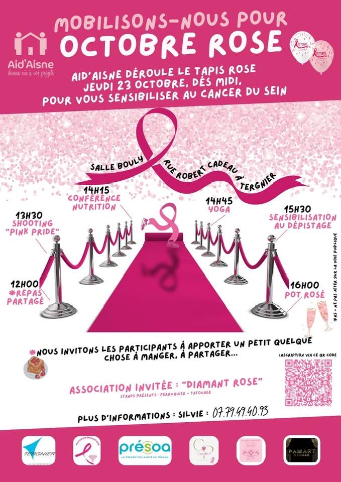 Mobilisons-nous pour Octobre Rose ! Aid'Aisne déroule le tapi rose le jeudi 23 octobre dès midi avec de nombreuses animations : - 12h repas partagé, chacun amène quelque chose à partager - 13h30 shooting "pink pride" - 14h15 : conférence nutrition - 14h45 : Yoga - 15h30 Sensibilisation au dépistage - 16h Pot Rosé Association invitée " Diamant Rose" Rendez-vous à la salle Bouly Rue Robert cadeau à Tergnier. Plus d'informations : Silvie au 07 79 49 40 93