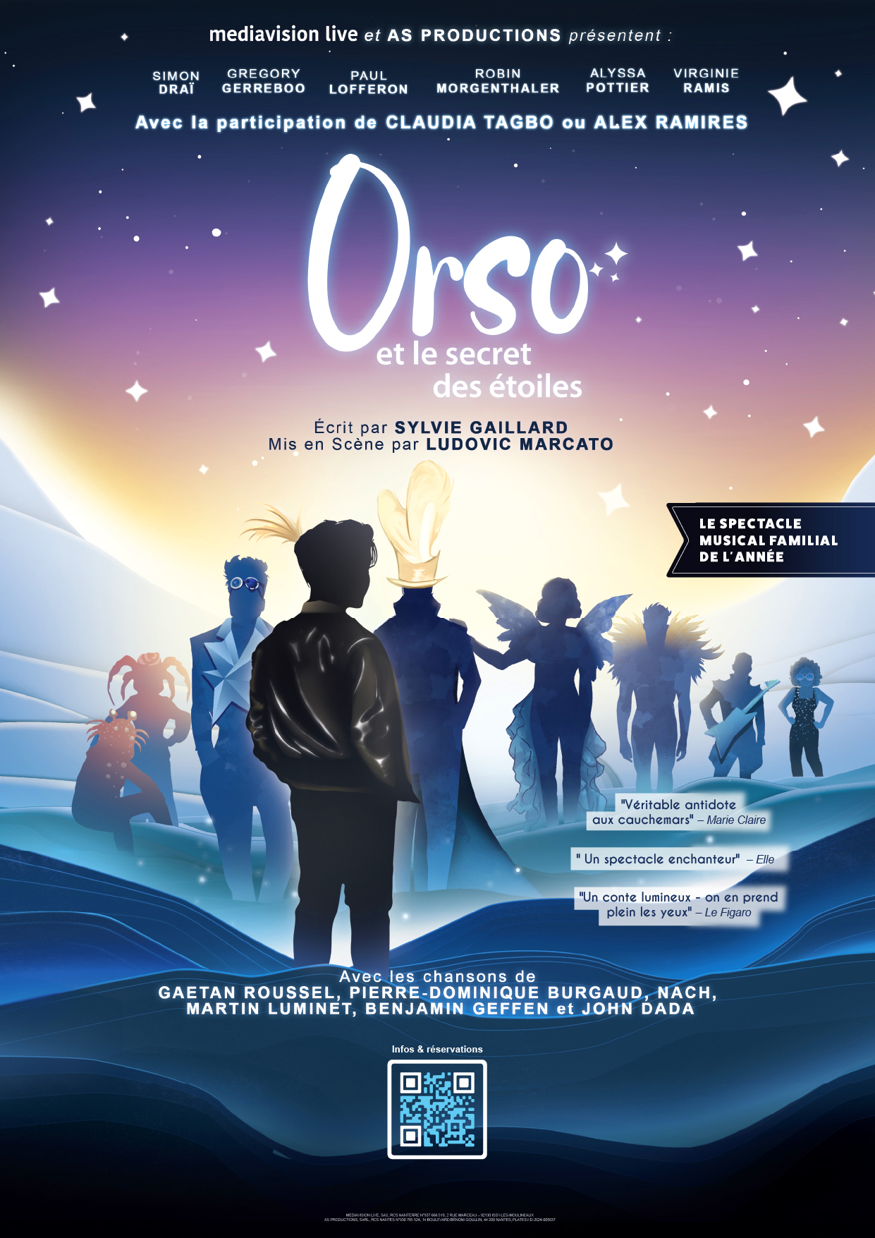 Orso et le Secret des Étoiles est un conte musical tous publics qui aborde avec humour et poésie des thèmes universels : le rapport au temps et à la nuit, la confiance en soi. Le tout est porté par les chansons d’auteurs-compositeurs de premier plan (Gaëtan Roussel, Anna Chedid, etc.) et interprété sur scène par une troupe de chanteurs / danseurs spectaculaires.