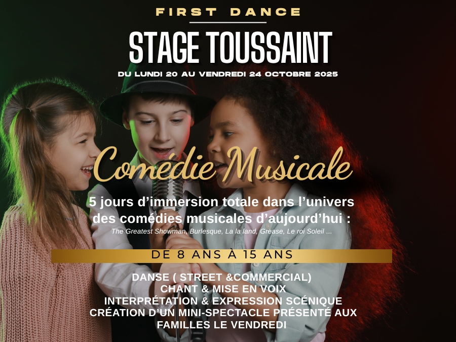 Plonge dans l’univers magique de la comédie musicale pendant les vacances de la Toussaint ! 5 jours d’immersion artistique pour les enfants et ados : danse, chant et interprétation scénique encadrés par l’équipe pédagogique de First Dance. Un stage ludique, créatif et bienveillant, ouvert à tous niveaux, pour révéler la star qui sommeille en toi !