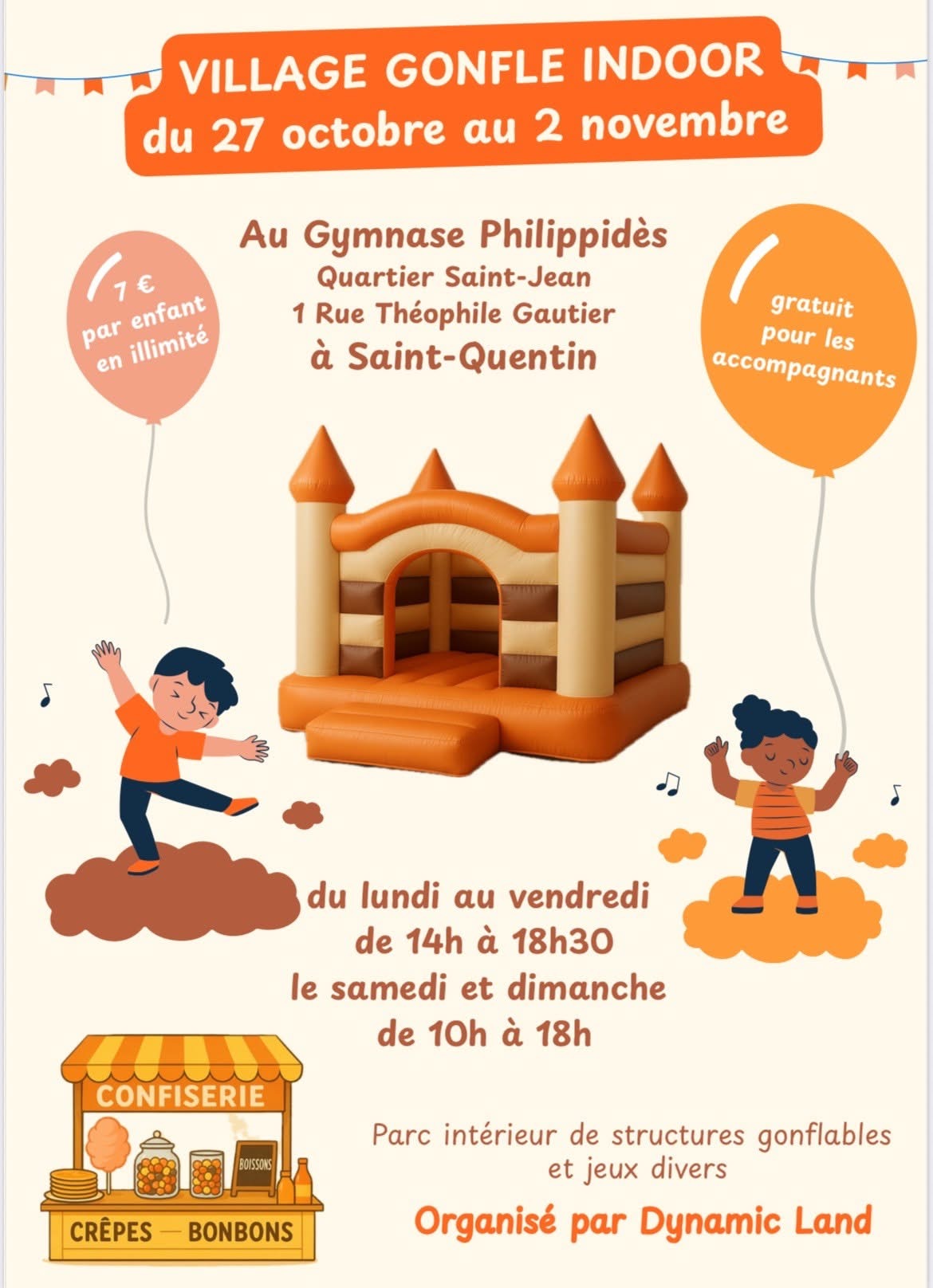 Le Village Gonflé de Dynamic Land fait son retour pour les vacances au gymnase Philippidès Saint-Quentin du lundi 27 octobre au dimanche 2 novembre 2025 : structures gonflables et aire de jeux multi-activités pour les enfants de 3 à 12 ans. Du lundi au vendredi de 14h à 18h30 samedi et dimanche de 10h à 18h Tarifs : - 7€ pour les 3/12 ans (en illimité) - Gratuit par accompagnateur majeur Crêpes, confiseries, barbes à papa et bonbons, boissons et café.