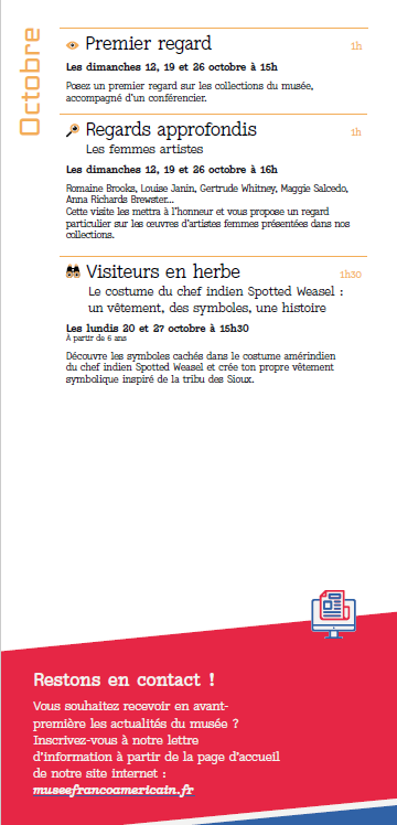 Rendez-vous à 15h30 le 20 et 27 octobre pour un atelier sur le thème suivant : Le costume du chef indien Spotted Weasel : un vêtement, des symboles, une histoire. Découvre les symboles cachés dans le costume amérindien du chef indien Spotted Weasel et crée ton propre vêtement symbolique inspiré de la tribu des Sioux. A partir de 6 ans. Durée: 1h30 Réservations: 03 44 38 47 10 / reservation.blerancourt@culture.gouv.fr Tarifs: 1 accompagnateur gratuit et obligatoire: 7€.